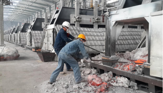 圖為:工投公司電解一車間當(dāng)班人員在打撈殘極塊